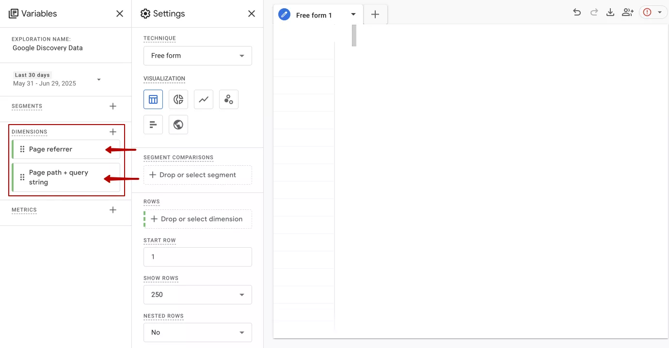 In the DIMENSIONS block on the left side of the Variables tab, select: Page referrer and Page path + query string (the URL of the page transition).