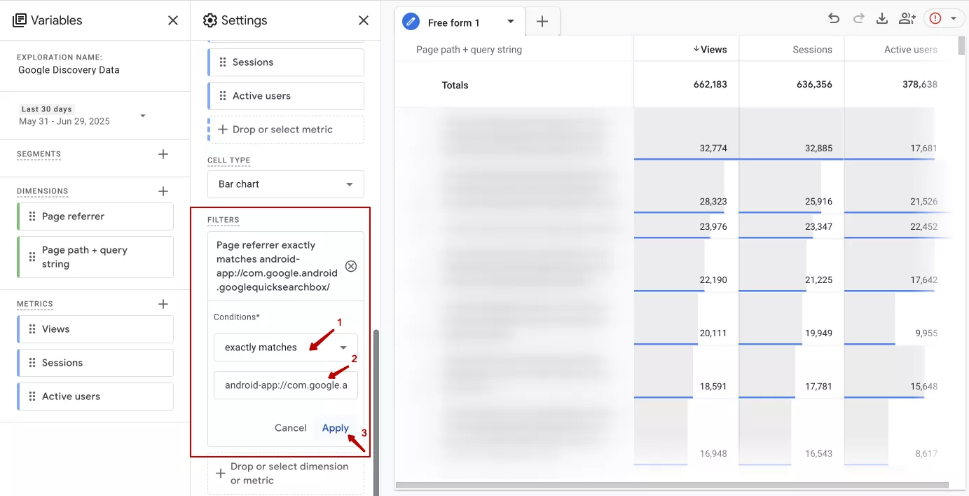 In the FILTERS block on the Settings tab, select Page referrer (URL of the page transition) from the drop-down list. Next, specify the exact matches option in the conditions. Then, select the value android-app://com.google.android.googlequicksearchbox/ and click Apply.