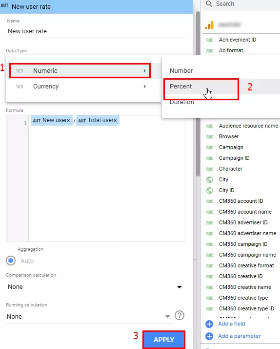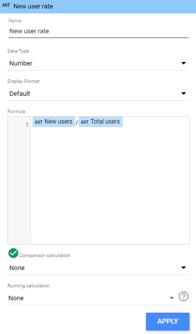 Click the Create new field button. A console will appear where you can enter the name, field type, and formula. Name the field New user rate. To calculate the number of new users, divide that number by the total number of users.