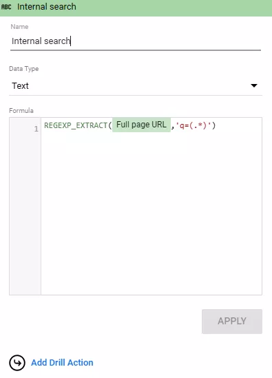 To understand what users are searching for, it is a good idea to extract the search query from the URL. To do this, use the function regexp_extract(full URL of the page,‘search=(.*)’).