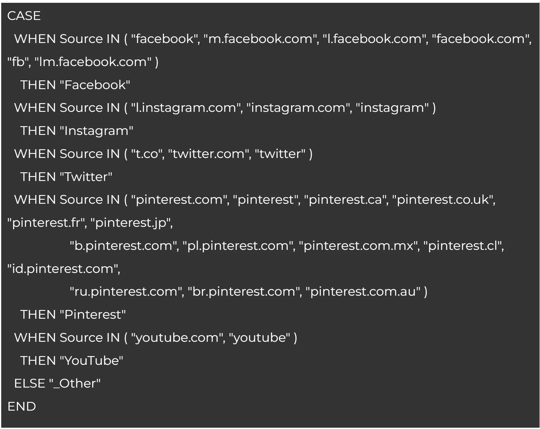 Imagine you need to analyze data on how users found the site. The lower function solves the problem of upper and lowercase, but it doesn’t address the problem of different names for the same source.