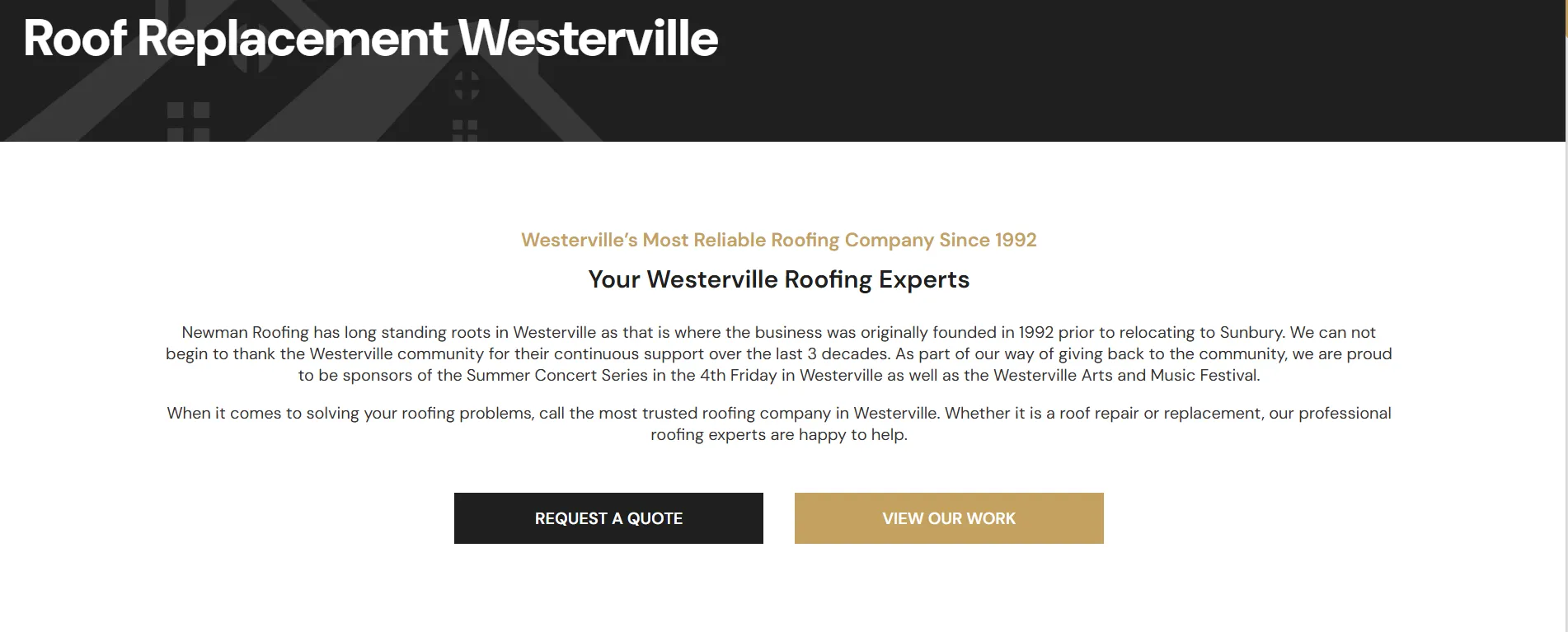 Case: Newman Roofing professional services publicly says on its Westerville service-area page that it sponsors the Summer Concert Series and the Westerville Arts and Music Festival. Uptown Westerville’s event page also references the “Newman Roofing Summer Concert Series” and links to Newman Roofing.
